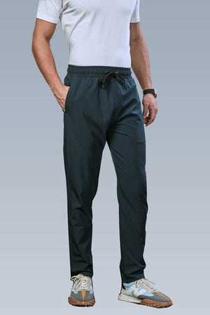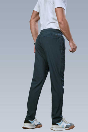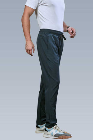 Leisure Track Pant Crafted from smooth, lightweight paper cloth, these regular-fit leisure track pants offer quick-dry comfort and 4-way stretch flexibility. Featuring metal-tipped drawstrings, a stylish dummy fly, and multiple pockets, including an invisible zip pocket, they blend utility with sleek design. The clean-finished hem adds a modern touch, making them ideal for both lounging and casual outings with a sharp, versatile edge.